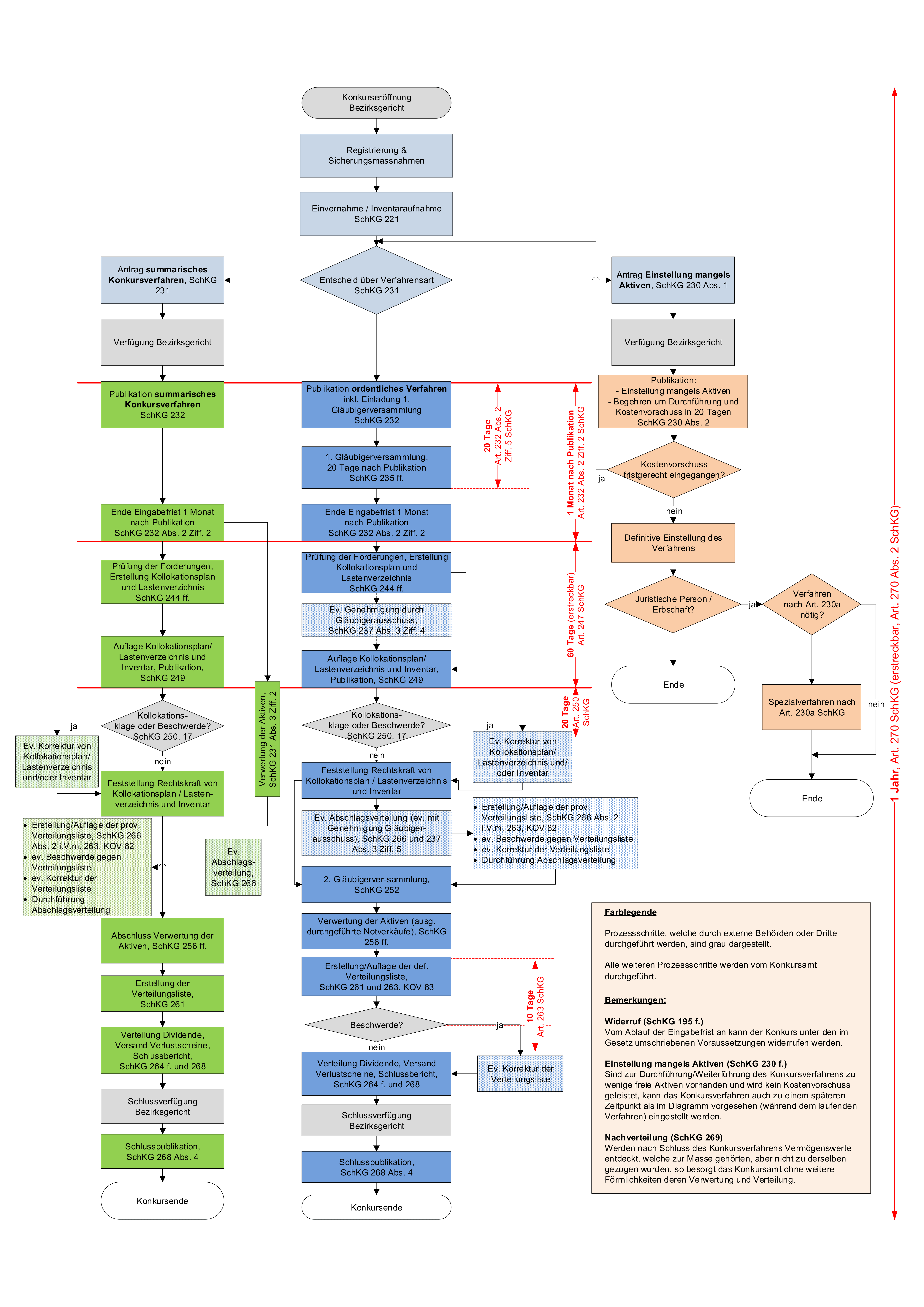 Grundlage zur Durchführung eines Konkursverfahrens bildet das Bundesgesetz über Schuldbetreibung und Konkurs (SchKG vom 11.04.1889 mit letzter Revision vom 16. Dezember 1994, in Kraft seit dem 01.01.2014) mit zahlreichen Nebenerlassen und Verordnungen (z.B. die Verordnung (VO) über die Zwangsverwertung von Grundstücken (VZG), die Konkursverordnung (KOV), der Gebührentarif (GebVO) u.a. mehr.